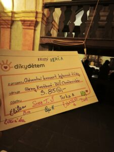 20. prosince, Kostel U Ježíška – Koncert kytarové třídy Aleny Kozákové, ZUŠ Chválenická – 1.493,- Kč (po vypsání šeku – viz foto, bylo přidáno ještě 100,- Kč).